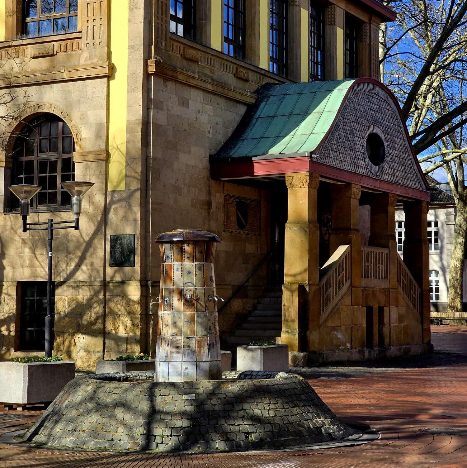 Auf der Dr- Tusch-Straße befinden sich neben der Einfahrt zur Tiefgarage rechts und links zwei Durchgänge zum Platz der Deutschen Einheit, der auf Rückseite des Rathauses liegt. Zwischen diesen beiden Durchgängen befinden wird uns.